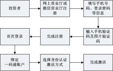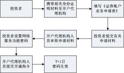 已開(kāi)證券賬戶的投資者可攜帶有效身份證明文件直接至與其具有委托交易關(guān)系的開(kāi)戶代理機(jī)構(gòu)或開(kāi)立相關(guān)證券賬戶的原開(kāi)戶代理機(jī)構(gòu),申請(qǐng)通過(guò)統(tǒng)一賬戶平臺(tái)提交網(wǎng)絡(luò)用戶開(kāi)通指令的方式辦理身份認(rèn)證,開(kāi)通指令提交后次日投資者方可使用其證券賬戶號(hào)及開(kāi)通時(shí)設(shè)置的初始密碼登錄本公司網(wǎng)站辦理查詢、投票等業(yè)務(wù)。主要流程如下: