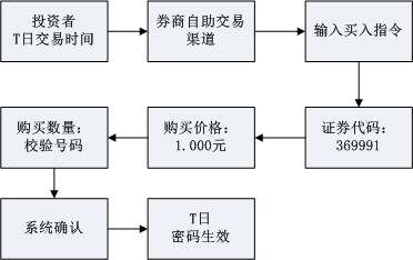 交易時(shí)間內(nèi),投資者使用上述證券賬戶通過(guò)證券公司自助交易平臺(tái)(如交易軟件、電話委托交易系統(tǒng)等)以買(mǎi)入指令的方式,輸入證券代碼(369991)、購(gòu)買(mǎi)價(jià)格(密碼激活為1.000元,密碼重置為2.000元)、委托數(shù)量(收到的校驗(yàn)號(hào)碼)后,將買(mǎi)入指令提交至證券公司。圖示如下: